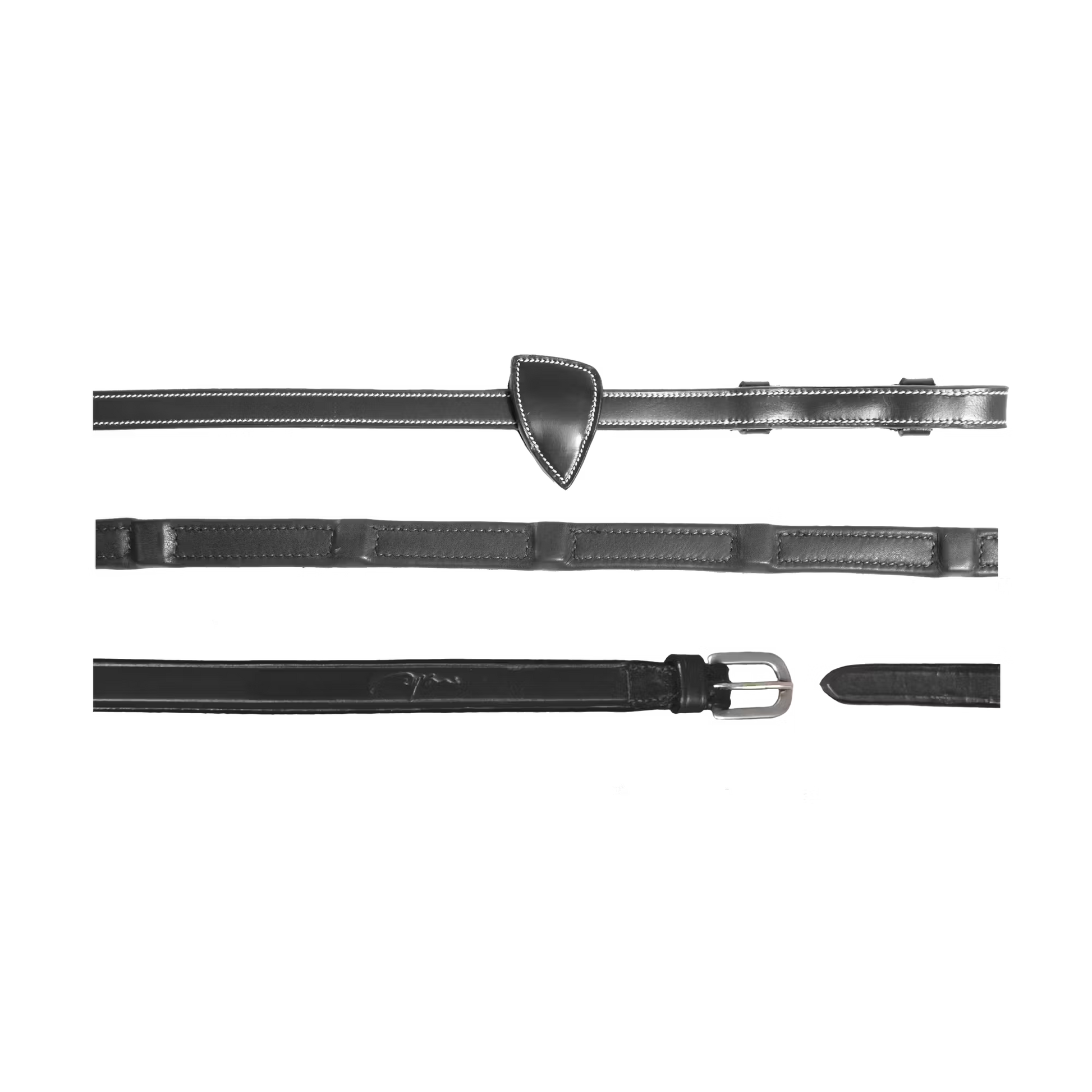 The reins are part of the Working collection, which means the color of the stitching is cream. The buckles are stainless-steel. Available in brown and black.