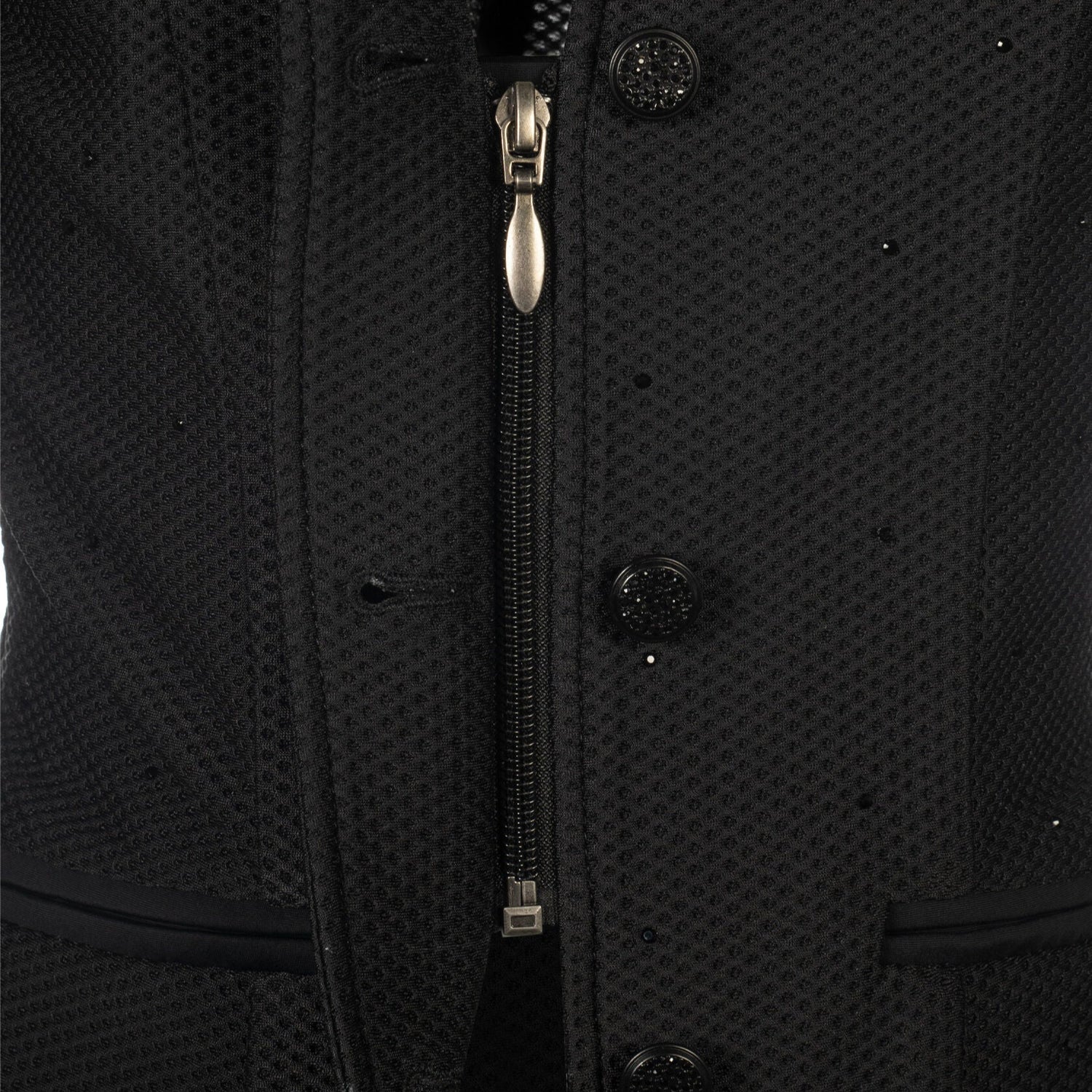 The competition jacket Crystal Kids combines elegance and functionality so that even the little ones can make a big impression at competitions. The breathable material made of lightweight mesh ensures a comfortable fit even in warmer temperatures, while the tailored cut and integrated riding slits offer optimum freedom of movement. The concealed zip behind the button placket and the trim with fine rhinestones give the jacket an elegant touch. The material is crease-resistant and elasticated and therefore adapts perfectly to the shape of the body.