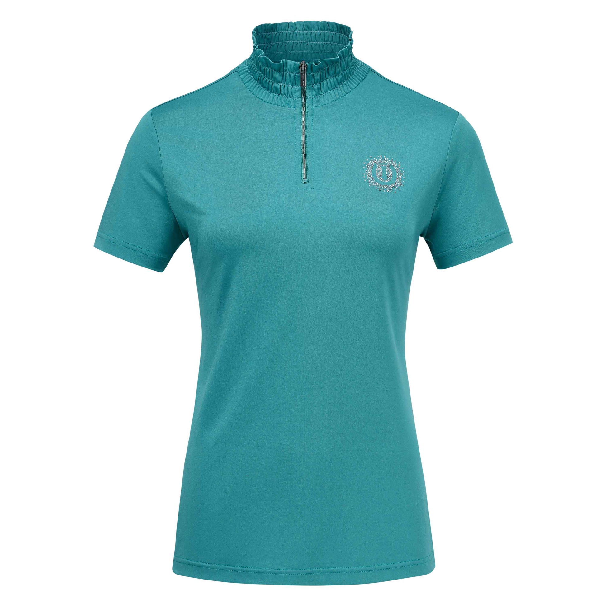 Half zip top * Standing collar with smock * Short sleeves * Rhinestones artwork at chest wearers left * Branded puller