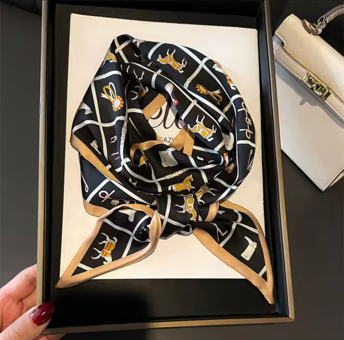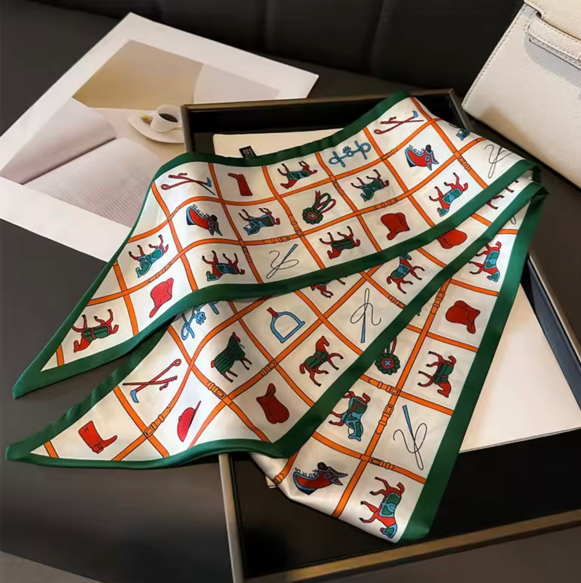 A skinny scarf can be tied around the neck for a for a chic look, used as a stunning hair tie on a pony tail, or tied around the crown of a hat.