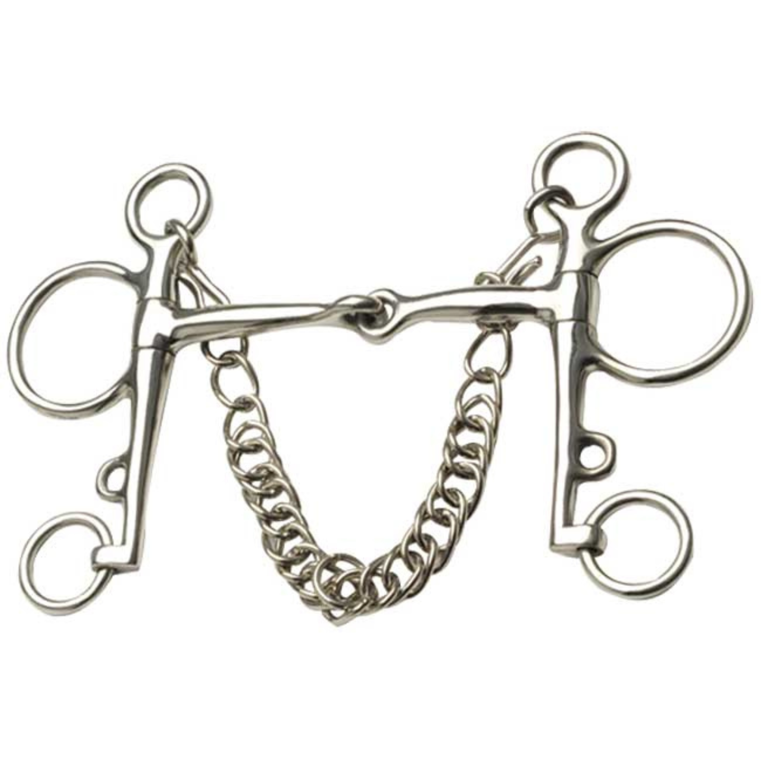 Stainless Steel. Single jointed mouth pelham bit complete with double link curb chain.