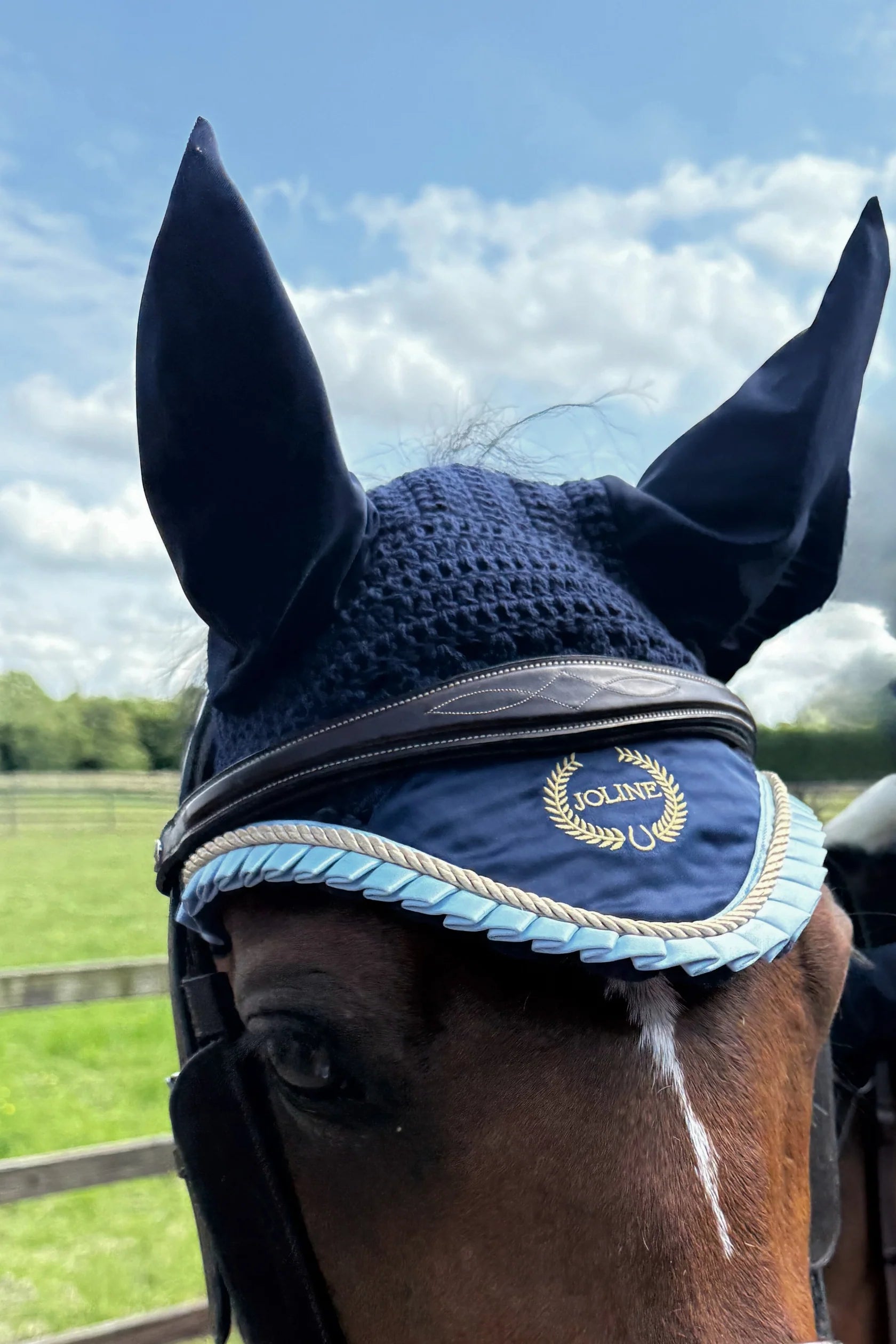 Joline Earnets are a elegant and practical choice for any pony or horse. This earnet features a white ruffle trim, finished with a gold cord for a luxurious look. The elasticized ears are made of a stretchy, breathable, antimicrobial and quick drying material.