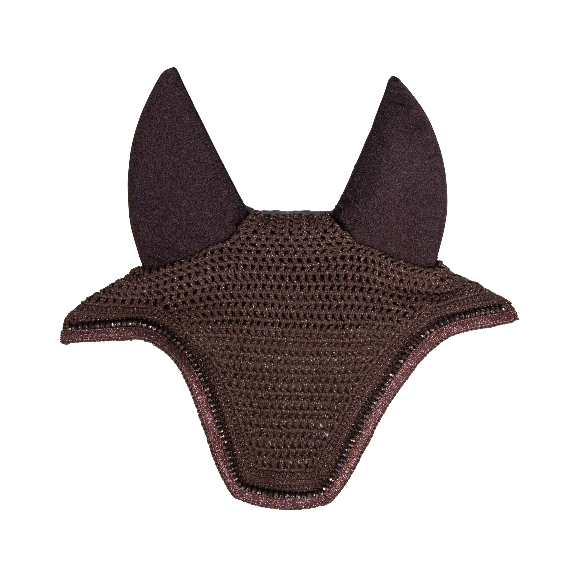 This fly veil is hand knitted for better durability, topped off with pearls and a glitter band in the same color as the fly veil. The Fly Veil Glitter Band does not have a visible logo, therefore rider or sponsors can embroider their own logo.