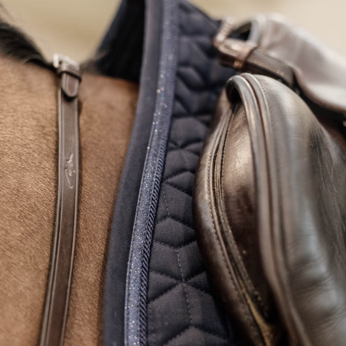 Our Saddle Pad Glitter Stone is shaped for jumping or dressage. It has no annoying straps to attach to the saddle, only a nylon strap for the girth.