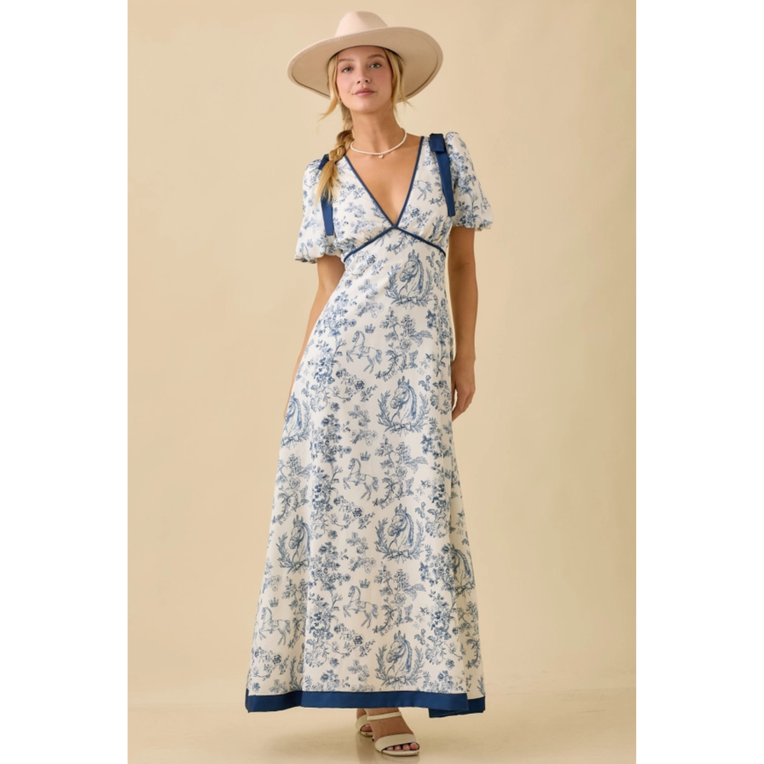 Deep-Neck Maxi Dress With Bubble Sleeve And Shoulder Ribbon Bow Detail With Contrast Binding Detail Feminine and flowy, this elegant maxi dress features a deep V-neckline, voluminous bubble sleeves, and charming ribbon bow details at the shoulders. The contrast binding adds a modern touch to this romantic silhouette-perfect for weddings, garden parties, or vacation nights.