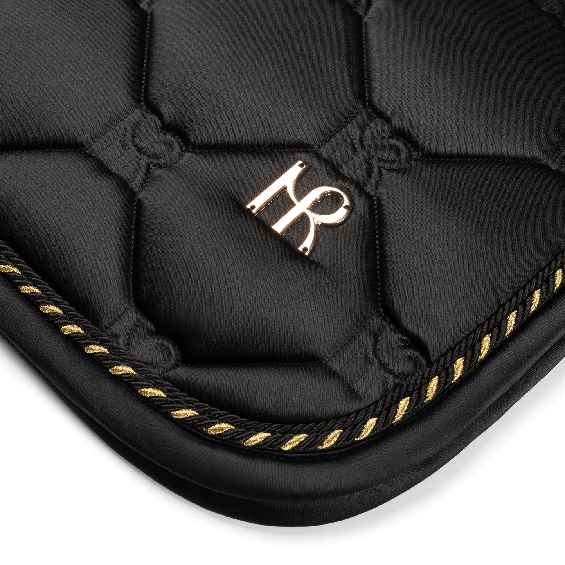 Mix and match with your riding wear for a head-to-toe Mrs. Ros equestrian look. A beautifully crafted saddle pad that is a one-of-a-kind addition to your Tack closet! With double rope pipping in contrasting colors and a golden cutout diamond metal logo, you and your horse will fall in love with this gorgeous saddle pad.