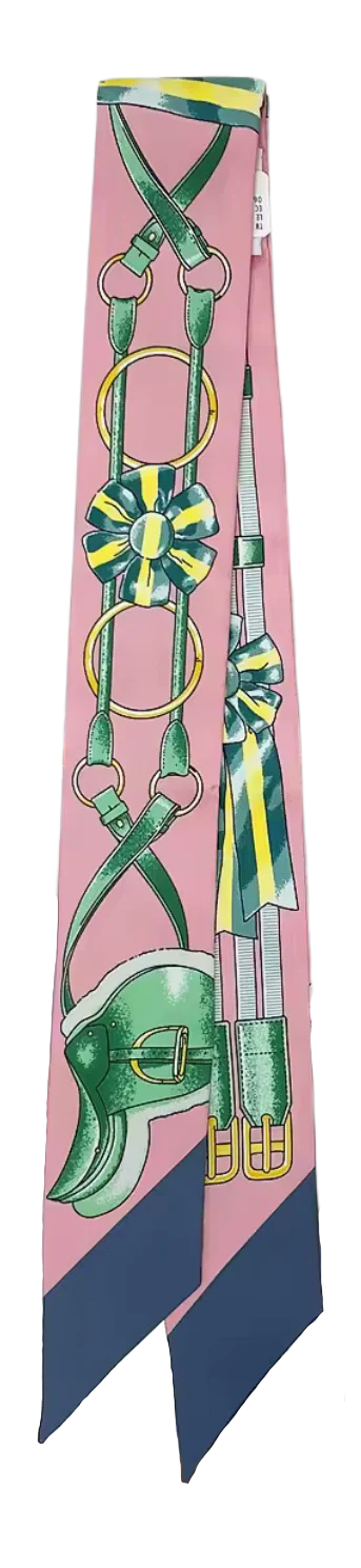 A twilly scarf, a long and narrow piece of fabric, that has a robust "twill" weave and offers a versatile array of uses that extend beyond traditional neckwear.