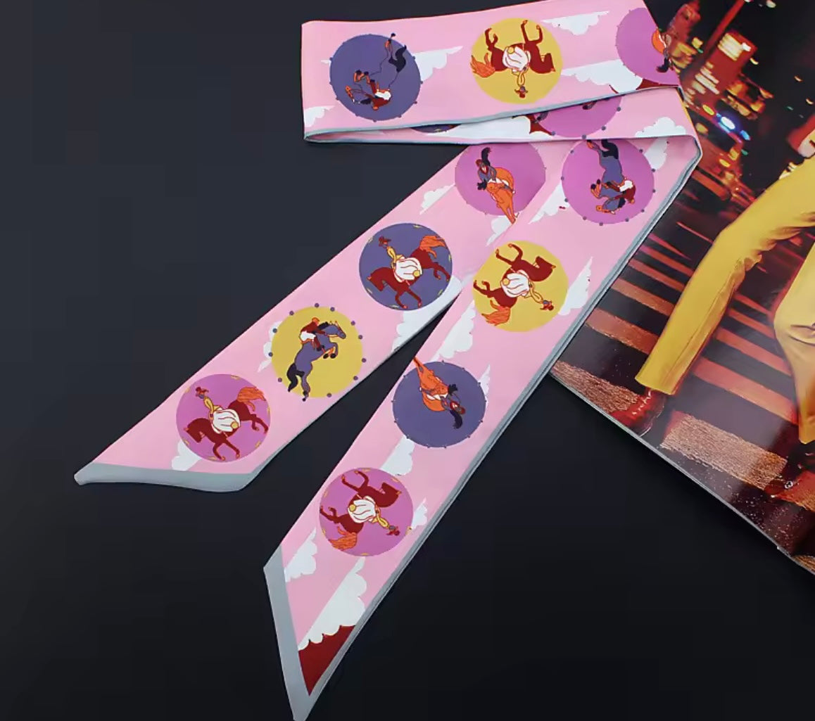 A twilly scarf, a long and narrow piece of fabric, that has a robust "twill" weave, and offers a versatile array of uses that extend beyond traditional neckwear.