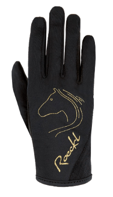 The backhand is made from breathable stretch Lycra to offer first-class comfort and unlimited flexibility in the fingers. It features a stylized horse and the ROECKL lettering-logo in an elaborate glitter print, and is suitable for horse-mad children and small adults with sizes available from 3 to size 7