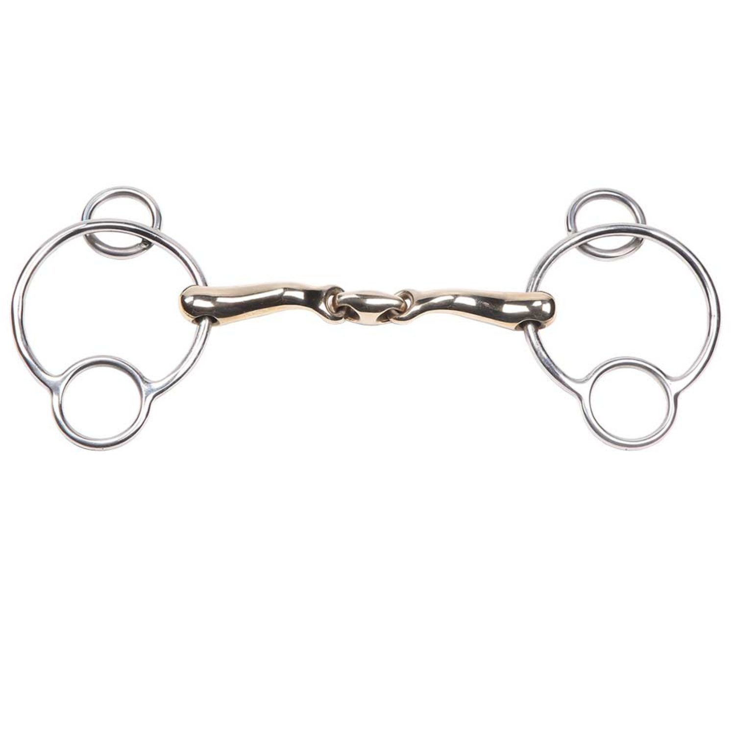 This is a popular bit in showjumping. It offers a mild gag action, while the curved mouthpiece and ring design gives clear turning aids. The top (bridle cheek) rings are very cleverly angled in order to avoid excessive cheek pressure.